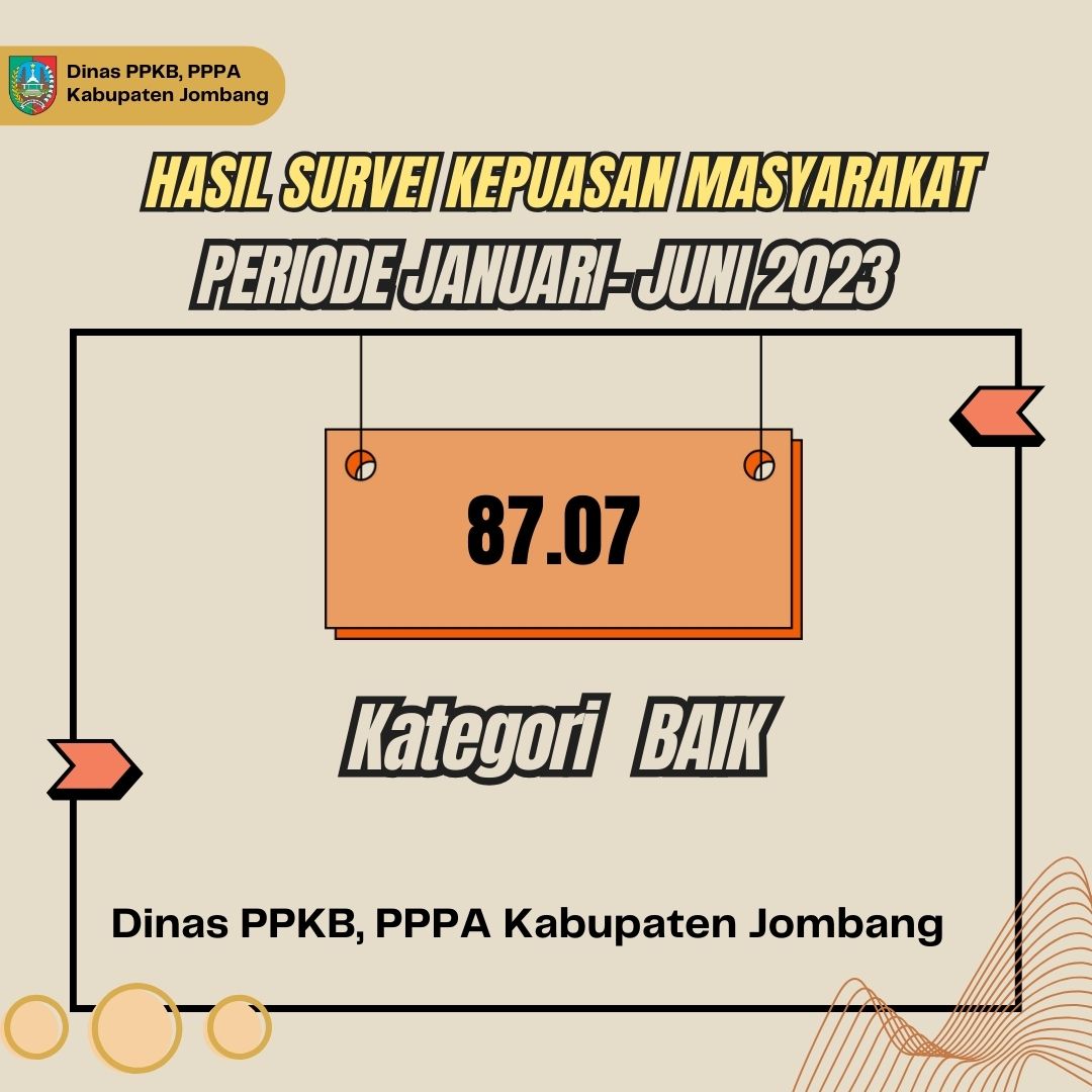 Hasil survei kepuasan masyrakat Dinas PPKB PPPA Kab. Jombang rentang waktu bulan Januari sampai bulan Juni 2023 mendapatkan nilai 87,07 dengan kategori Baik.